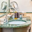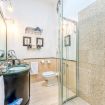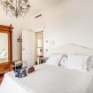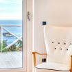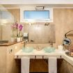 This master suite with sea view bathtub has a canopy queen-size bed (160 cm x 200 cm) and two glass picture windows, allowing you to go to bed and wake up facing the sea. They also serve as the door in order to access the outside terrace, hot tub, and outdoor sofas. You will find the 100% Egyptian cotton linens and towels in this room to be beautifully soft and luxurious. A 47” Led Smart TV hangs on the wall, where you can enjoy watching hundreds of international channels on Sky TV.